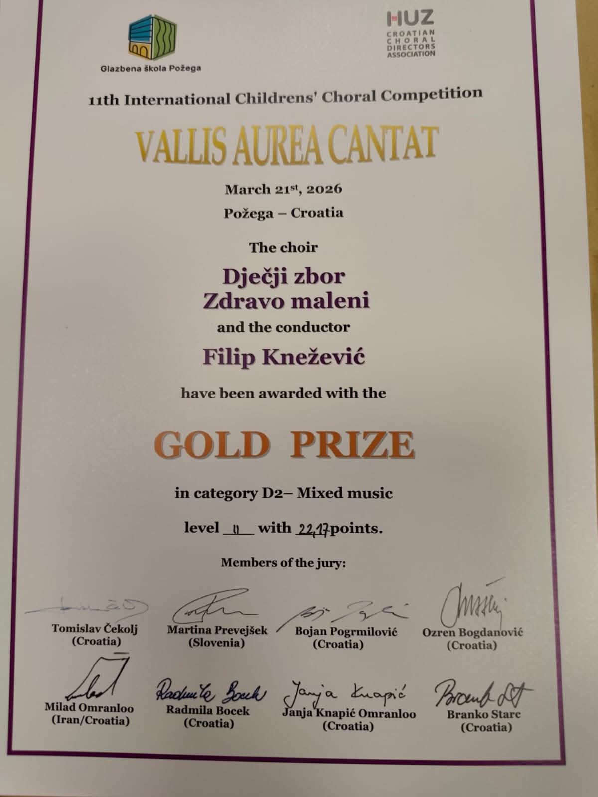 Dječji zbor „Zdravo maleni“, pod vodstvom Filipa Kneževića, sudjelovao je na X. izdanju međunarodnog natjecanja dječjih zborova “VALLIS AUREA CANTAT” te osvojio zlatnu nagradu u kategoriji  D2 – mješovita glazba, kao jedan od 27 zborova iz Hrvatske i Slovenije. Također, za ovaj nastup, posebno priznanje dodijeljeno je i voditelju zbora Filipu Kneževiću za izuzetnu umjetničku i dirigentsku izvedbu.