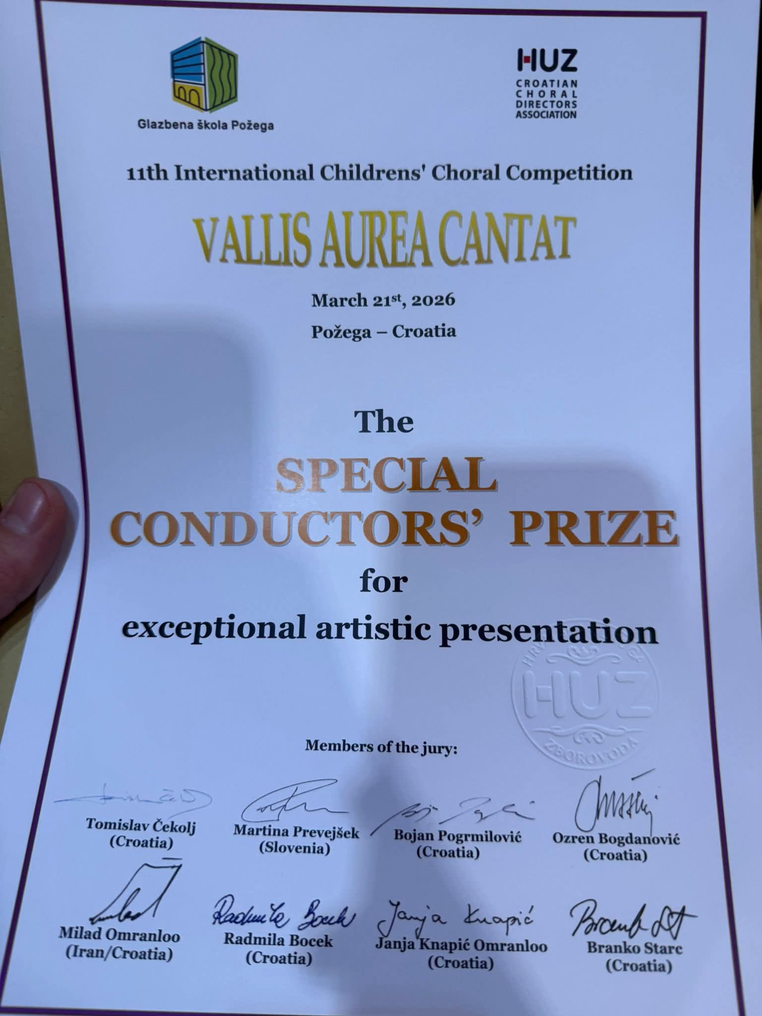 Na manifestaciji u organizaciji Hrvatske udruge zborovođa i Glazbene škole Požega, održanom u subotu, 21.ožujka u koncertnoj dvorani Glazbene škole Požega, sudjelovali su zborova s područja Republike Hrvatske i inozemstva, a natjecalo se u kategorijama klasične, folklorne, popularne i mješovite glazbe.